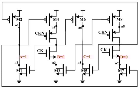 The SEU-sensitive node pairs in the DICE memory cell are shown in Figure 5. The state of node A is flipped from 1 to 0 when the heavy ion is irradiated on the reverse-biased NMOS drain region (n1), so that NMOS-M7 is turned off and PMOS-M4 is turned on, which makes the state of node B flip from 0 to 1. Then, PMOS-M6 will turn off while nodes C and D are both in a floating state. The DICE cell will finally flip if both nodes are simultaneously affected by the charge sharing effect or oblique angle injection. Therefore, all sensitive node pairs should be properly laid out during the layout design stage.
