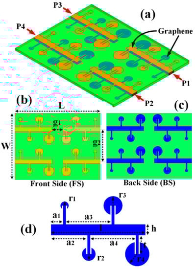 The MIMO antenna with Yagi-like structure using graphene patch geometries is shown in Figure 1. Figure 1a shows the 4-port 2 × 2 MIMO antenna 3D view, with circular-patched geometry arranged in a Yagi-like structure. The antenna geometry has been formed using graphene material with a thickness of 0.03 µm. The conductivity of the graphene sheet was set as 108 S/m, with a loss tangent of 0.004. Because of its exceptional electromagnetic, mechanical, and tunable qualities, graphene material is widely employed in a wide range of Terahertz (THz) applications [18,19]. However, various articles have also observed that the multilayered graphene ink/powder does not provide great tunability. Hence, the fixed conductivity constant is considered for the overall structure. The overall size of the antenna is set as L × W = 620 × 800 µm2. The design equation for the proposed antenna structure is given in Appendix B. The polyamide substrate thickness is 16 µm, with a loss tangent of 0.004 and a dielectric constant of 4.3 [20,21]. The dimensions of the structure are shown in Table 1. The dimensions shown in the structure were calculated by considering the wavelength of 1 THz signal (~300 µm for a single radiating element). The other dimensions were calculated by placing the periodic Yagi-like structure at an equal distance. The radius of the circular patch is set from small to large to couple all the small and large frequencies.