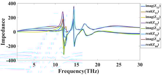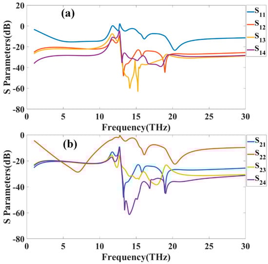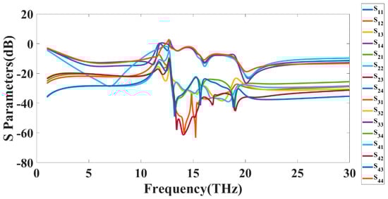 Figure 11 shows the calculated impedance for the all-port antenna, with a frequency range impedance variation of 9–80 Ω at 1–10 THz. Similarly, an impedance variation of 25–110 Ω was observed at 15–20 THz. Therefore, we can apply the antenna’s feeding using multiple methods that offer impedance variation through various parameters. For example, the sub-millimeter wave antenna feeding using a diagonal horn structure can be one of the methods to feed these types of antennas [37,38]. With its wide and thin walls running along the diagonals of the cross section of the pyramid, this feeder antenna has a horned section with a flared pyramid top. A second method for designing the mm-wave feeding uses a platelet conical corrugated structure [38,39]. Figure 12 shows the variation in S parameters by considering all-port excitation. The results show variations in individual port return loss and other active reflectance coefficient values. As shown in Figure 12, the return loss and other reflectance coefficient values are below −10 dB for all operating bands defined in Table 1. These results help us identify the active reflectance coefficient when all the ports are excited. The values of the active return loss of <−10 dB indicate the overall wave interference performance of the proposed antenna when it is entirely operated with all-port excitation.