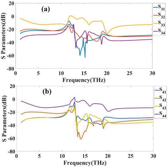 In this research, the various antenna structures were simulated to identify the optimized results for the MIMO antenna. We have investigated the five types of antenna structures. The proposed antenna and its various sub-designs (Types), as shown in Table A1, were numerically investigated using the HFSS Electromagnetic simulator tool. These antennas were simulated by considering 7.5 THz of the resonating frequency. Figure 2 and Figure 3 show the variation in S parameters for the different port excitation of Type 1 (2 × 2) MIMO design. Figure 2a,b shows the variation in the S parameters while exciting port 1 and port 2 for 1–30 THz of the frequency band. Similarly, Figure 3a,b shows the variation in S parameters for port 3 and port 4 excitation. The detailed comparative results are shown in Table 2 for different port excitations. In all the port excitation conditions, three operating bands were observed, with a wide band of accepted return loss. In port 1 excitation, the maximum bandwidth (S11 < −10 dB) was observed at 10.02 THz, with maximum return loss on band 3 with −23.44 dB, while the minimum bandwidth observed in port 1 excitation was 0.63 THz. In port 2 excitation, the maximum operating bandwidth (S22 < −10 dB) was observed at 9.12 THz, with −22.55 dB of the minimum return loss. Similarly, in port 3 and port 4 excitation, the maximum bandwidth was observed at (S33 < −10 dB) 10.86 THz and (S44 < −10 dB) 10.96 THz, with −26.59 dB and −18.85 dB of the return loss, respectively. The directivity with co-polarization and cross-polarization is shown in Figure 4a.