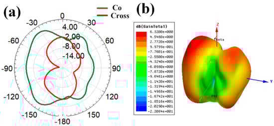 (a) Variations in S-parameters (S11) for the structure were all circular patched structures in a one-sided (Type-5) antenna. Calculated directivity in (b) 2D (with co- and cross-polarization) and (c) 3D, with a maximum directivity of 6.45 dB.