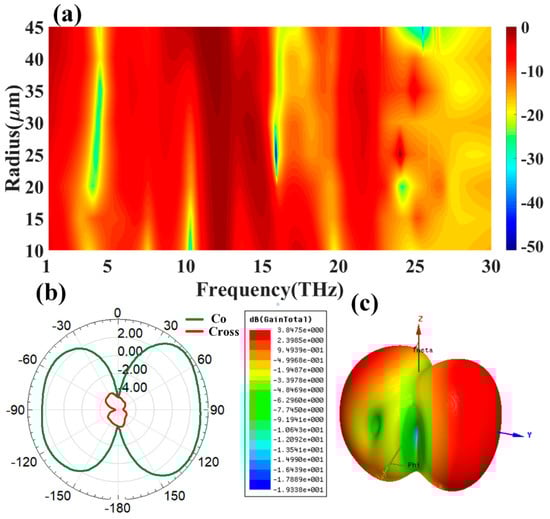 (a) Variation in S-parameters (S11) for the different radius values for type-5 antenna. Calculated directivity in (b) 2D (with co- and cross-polarization) and (c) 3D, by considering a radius of 20 µm.