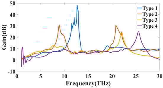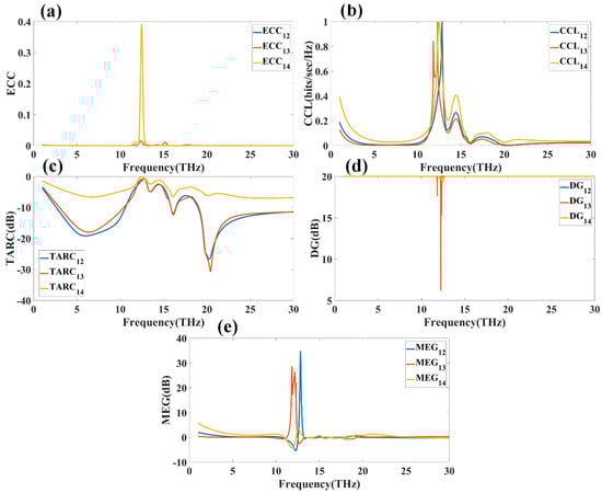 Figure 10a depicts the relationship between ECC and frequency for the suggested type 1 antenna for the different port excitations. On the other hand, it can be noticed that the ECC of the antenna remains below 0.001 over its whole operational bandwidth (1–10 THz and 15–30 THz). These ECC values make the system stable. The lower value of the ECC obtained suggests less correlation between the antenna components themselves. The values are much lower than the allowed limit of 0.5, ensuring that the suggested antenna would provide satisfactory MIMO performance. Fading is reduced by combining antenna components that have distinct fading characteristics. To calculate diversity gain [23], one must compare a diversity antenna system to its equivalent single diversity antenna system in a given channel and determine the difference in signal-to-noise ratio. DG may be evaluated in terms of a theoretical maximum diversity gain of 10 dB and an envelope correlation coefficient, as shown in Equation (8). The MIMO antenna patch components are more isolated when the diversity gain increases. In other words, the DG should be at least 9 dB higher than that. The estimated DG values are over 20 dB over all three working bands of the antenna, as shown in Figure 10d. This assures that the suggested MIMO structure diversity performance is good.