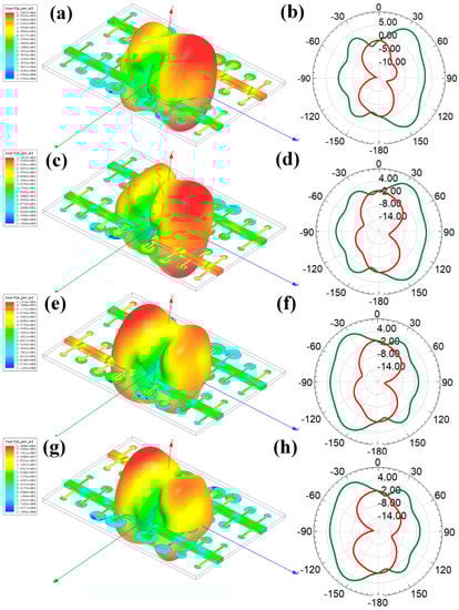 Variation in gain for the different modes of port excitation, along with co- and cross-polarization effects. Three-dimensional directivity with co- and cross-polarization for port excitation conditions of (P1, P2, P3, P4): (a) (1, 0, 0, 0), (c) (0, 1, 0, 0), (e) (0, 0, 1, 0), and (g) (0, 0, 0, 1). Two-dimensional directivity with co- and cross-polarization for port excitation conditions of (P1, P2, P3, P4): (b) (1, 0, 0, 0), (d) (0, 1, 0, 0), (f) (0, 0, 1, 0), and (h) (0, 0, 0, 1). co- (green line) and cross-polarization (red line).