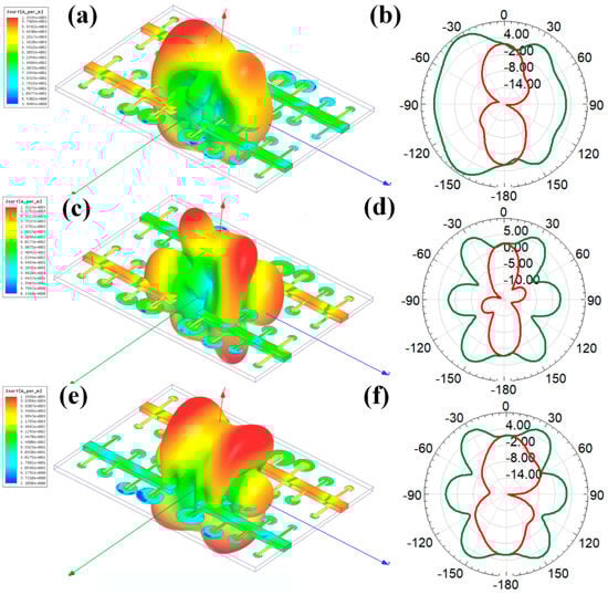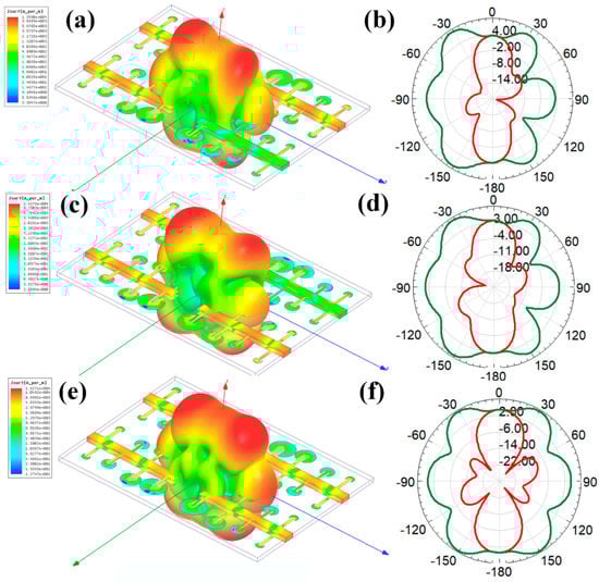 Variation in gain for the different modes of port excitation, along with co- and cross-polarization effects. Three-dimensional directivity with co- and cross-polarization for port excitation conditions of (P1, P2, P3, P4): (a) (0, 0, 1, 1), (c) (1, 0, 0, 1), and (e) (1, 0, 1, 0). Two-dimensional directivity with co- and cross-polarization for port excitation conditions of (P1, P2, P3, P4): (b) (0, 0, 1, 1), (d) (1, 0, 0, 1), and (f) (1, 0, 1, 0). co- (green line) and cross-polarization (red line).