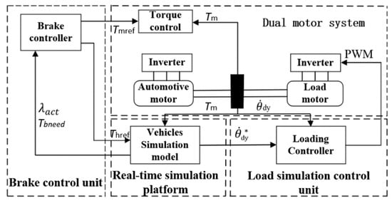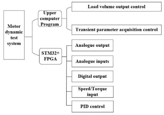 High-speed measurements and dynamic loadings of the motor transient parameters are realized, as shown in the structural block diagram shown in Figure 1. The dynamometer is coaxially connected to the tested motor. Various loads are loaded on the tested motor through the dynamometer control system so as to simulate the torque, speed, current, voltage, power, efficiency, and other parameters of the motor in actual operation, as well as other special dynamic test items, such as the safety test, dynamic balance test, and NVH (vibration and noise life) test. When loading, the upper computer sends instructions to control the free loading engine to output the control signal, which is input to the dynamometer drive controller. After the power of the controller is amplified, the control signal is loaded on the load motor so as to drive the load motor in order to load the tested motor. At the same time, the torque−speed transducer feeds back the speed and torque of the measured motor to the free loading engine. The free loading engine adjusts the output of the load in real time according to the feedback value to realize constant speed loading or constant torque loading. The torque calculation formula is as follows:
