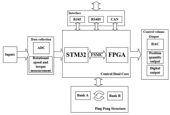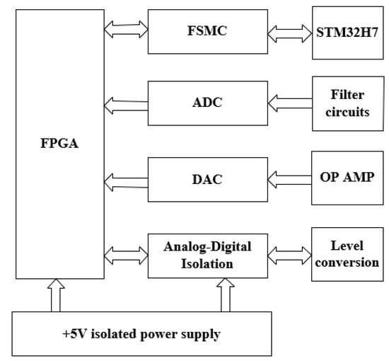 The circuit structure of the motor test system based on STM32 and FPGA is shown in Figure 2. The system is composed of a user-defined signal output and a speed and torque acquisition circuit. Firstly, STM32 receives the control signals, such as the loading waveform type and waveform parameters, sent by the PC ethernet port, which generates the corresponding analog output or digital output, and obtains the output control signal through FMSC communication, FPGA analysis, magnetic coupling isolation circuit, and then the conversion of the corresponding functional modules. This signal is input to the tested motor or load motor driver to drive the corresponding motor. Secondly, when the real-time data waveform needs to be uploaded, STM32 receives the acquisition data command sent by the PC ethernet. After the speed torque feedback signal is sampled by the magnetic coupling isolation, level conversion circuit, and ADC, it is stored in the on-chip dual port RAM of FPGA, and then STM32 reads the data in the way of a ping-pong operation through the FMSC interface and sends it to the upper computer through the ethernet. The composition and functions of each part of the circuit are introduced below. The components are described below.