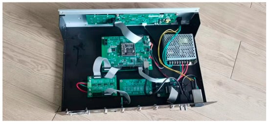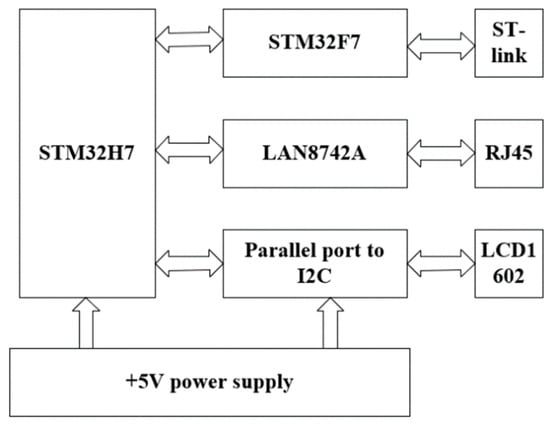 The minimum system circuit structure of the STM32 module is shown in Figure 3. The STM32 system selects STM32H743ZI2, with ARM-Cortex M7 as the core as the main control chip. The STM32H743ZI2 chip is a 32-bit microprocessor. It not only has rich peripheral resources, but also has a fast data processing speed and low power consumption. It is very suitable for occasions with high data speed and high system response requirements. According to the functional requirements of the project, circuits including the ethernet communication circuit, digital output circuit (DO), low-speed ADC circuit, display key circuit, SDRAM data cache, and so on, are designed. The ethernet communication circuit is mainly responsible for the data transmission between the upper computer and the lower computer. The digital output circuit mainly realizes the digital output control relay to pull in or open. The low speed ADC is mainly used to collect the working environment, such as the external temperature/humidity. The display key circuit realizes the human−computer interaction function. The SDRAM memory circuit mainly realizes the high-speed data cache.