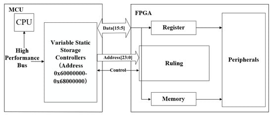 FSMC, a flexible static storage controller, can be connected with synchronous or asynchronous memory and a 16-bit PC memory card. The FMSC interface of STM32H7 supports memory such as SRAM, NAND FLASH, NOR FLASH, and PSRAM. The communication between STM32H7 and FPGA adopts a parallel FSMC bus. The collected data are saved by constructing a dual port RAM built in FPGA, and STM32H7 accesses it through the FMSC bus. According to the requirements of the collected data volume, the FMSC bus adopts a 24-bit address line and 16-bit data line, and contains six control signals at the same time. The STM32 chip selects FPGA to read and write data. The structural block diagram is shown in Figure 5.