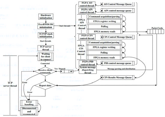 The software architecture of the lower computer mainly includes the STM32H7 end and FPGA end. The main tasks of the STM32H7 terminal include analysis of the host computer instructions, real-time data transmission, TCP/IP connection, and low-speed ADC data acquisition. There are many tasks and complex functions, so it is necessary to reasonably plan the scheduling relationship between tasks. In order to improve the real-time performance of the software and reduce the coupling between tasks, the software is transplanted with the real-time embedded operating system—Ferrets. The operating system provides task management, time management, semaphore, message queue, memory management, and other functions, and the kernel supports both the priority scheduling algorithm and polling scheduling algorithm. The system is open source, tailorable, and free, which can effectively save the cost of instrument development and is suitable for industrial application. The software flow chart of the master operating system with the embedded real-time operating system FreeRTOS as the core is shown in Figure 7. After the system is initialized, the FreeRTOS operating system is initialized, and then the FPGA AO control thread is started at the same time so as to control the output of the analog quantity. The FPGA AI control thread is used to control the acquisition of the analog quantity. The FPGA CI control thread is used to collect speed and torque. The FPGA PID control thread is used to control the speed and torque of the measured motor and load motor. The TCP server thread is used for data and instruction transmission, and has the function of TCP disconnection and reconnection.