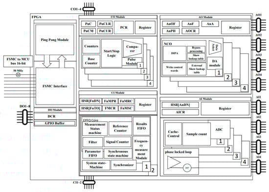 FPGA mainly completes external analog input acquisition, motor encoder signal input acquisition, data storage, receiving control instructions from ARM, controlling the analog output, controlling the position output, and controlling the digital output. The software architecture of FPGA is shown in Figure 8.