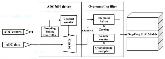 Ping-pong operation is a common data flow control processing technique that can realize seamless transmission of data flow. The specific algorithm is shown in Algorithom 1 below. During the first buffering cycle, the input data are cached to Data Buffer Module 1. In the second buffering cycle, the input data are cached to Data Buffer Module 2, and the data in Data Buffer Module 1 are output to the data stream operation processing unit through the selection of “Output Data Stream Selection Unit”. In the third buffering cycle, the data are cached into Data Buffer Module 1 by the input data stream selection unit, and Data Buffer Module 2 is selected by the output data stream selection unit to the data stream processing entity. In this design, the ADC data are driven by the ADC and enter the sampling module. After oversampling 200 times, the ADC data are sent to the data ping-pong module at a sampling rate of 1 KHz, so as to achieve a 1 ms data update rate. The ADC data acquisition process is shown in Figure 9.