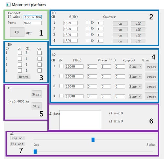 The system test mainly focuses on the measurement of the motor load and motor transient parameters. The test system is built with an SFT series electric dynamometer as the core, the model of the speed−torque sensor is the WSP speed−torque power sensor, and the output signals of the torque−speed are pulses with an amplitude of 5 V. The output range of the torque frequency signal is 5 KHz to 15 KHz, and the center frequency is 10 KHz. The output range of the speed frequency signal is 0 to 6 KHz, and the calculation formula for the speed and torque is given by Equations (1)–(3). The connection mode between the control system and the upper computer is 100 M ethernet. Figure 10 and Figure 11 show the hardware platform of the project and PC control interface, respectively.