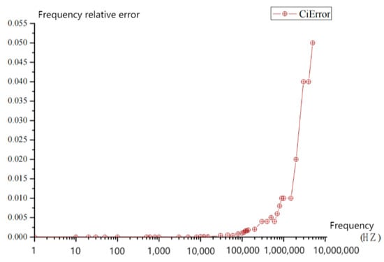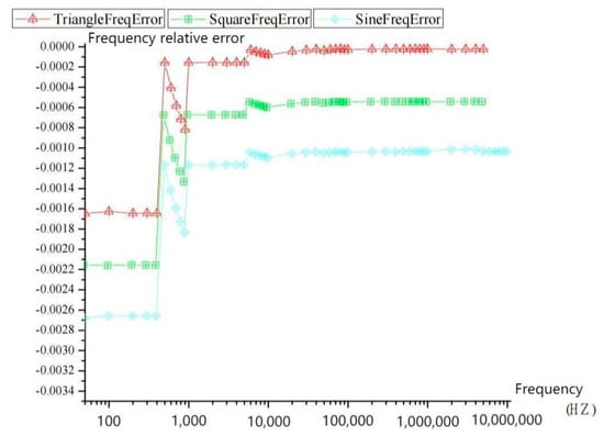 The loading quantity includes the analog quantity output, pulse output, and digital quantity output. The analog quantity output also includes regular sine wave output, square wave output, triangular wave, and DC quantity output. The frequency range of the output of the three AC signals is 1 Hz to 10 MHz. The relative error of the frequency output is shown in Figure 12. It can be seen from the figure that the relative error of the frequency output is within 2%, and there is almost no error in the low frequency band.