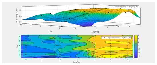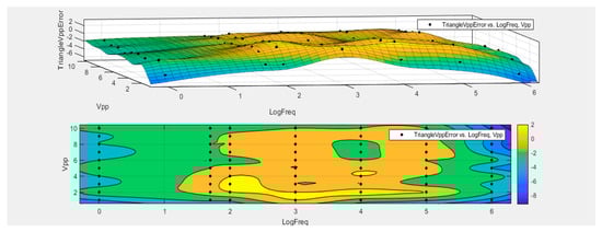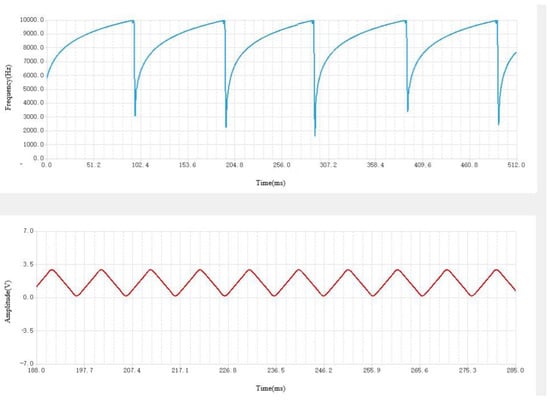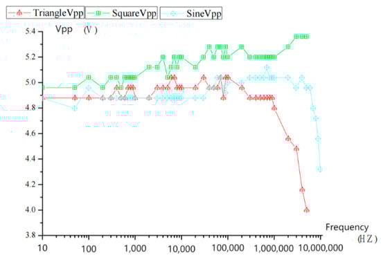 The output range of the analog DC bias output voltage is −5 V to +5 V. The relative error of the DC bias output is shown in Figure 13. The abscissa represents the peak value and the ordinate represents the output relative error. As can be seen from the figure, the maximum relative error of the output peak value should not exceed 0.4% in order to meet the needs of practical application. The continuous pulse output mode can control the output frequency and phase, so as to control the forward and reverse rotation of the motor. The square wave loading amplitude error, sine wave loading amplitude error, and triangular wave loading amplitude error are shown in Figure 14, Figure 15 and Figure 16, respectively. With the increase in frequency, the relative error increases slightly, and the relative error is within 0.8%.
