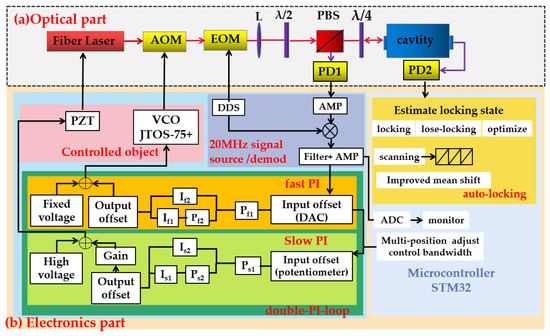As shown in Figure 1b, the electrical module consists of analog and digital components. The direct digital synthesis (DDS, AD9958) chip generates two 20 MHz signals. One signal is used to drive the EOM for phase modulation, while the other one is applied for demodulation. A homemade double-PI-loop feedback controller is developed to steer the piezo transducer (PZT) inside the laser head by a slow proportional–integral (slow PI) controller and the AOM by a fast PI controller, respectively.