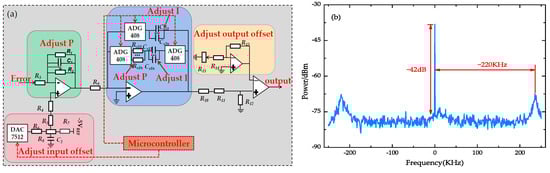 The fast PI module is extremely important to us, so it is introduced in detail here. As shown in Figure 2a, the fast PI module consists of two proportional and integration (PI) stages connected in series. The fast PI part, which receives the frequency discrimination error signal as input, first adjusts its offset by controlling the DAC (DAC7512) via the microcontroller unit (MCU, STM32F103ZET6). The potentiometer R2 adjusts the gain of the primary PI. In the second PI stage, the MCU controls analog switches (ADG408) to combine different resistors and capacitors with changing the gain of the second stage and the noise suppression range. Further, the bias of the output signal is adjusted.