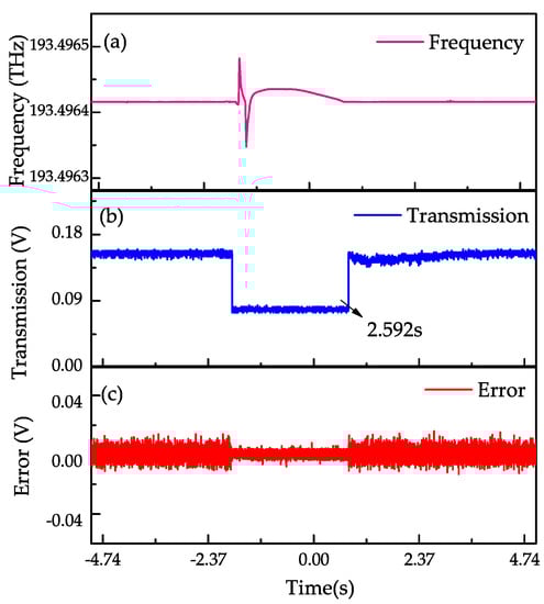 In the experimental system, we used C language to develop the software program for calculating the mean value of the shift vector, searching for the transmission signal behind the cavity and the locking optimization. A typical relocking process is shown in Figure 6. The frequency, transmission signal and error signal recorded during the auto-locking process are depicted in Figure 6a–c. The figure shows that it can be relocked at 2.6 s after the laser is unlocked. The results show that the relocking algorithm dramatically reduces the locking time when applied to the transmission signal’s searching process.