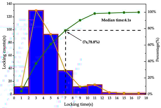 An indoor ultra-stable laser system is applied to evaluate the performance of the proposed relocking algorithm. The reference cavity’s active temperature control and vibration isolation are turned off, intended to simulate realistic operation conditions. The frequency locking of the ultra-stable laser is interrupted by switching off the EOM driving power for a short moment of ∼10 ms. When the cavity transmission drops below the threshold, the relocking process of the laser is triggered. In the experiment, we observed 306 relocking processes in a test period of ∼1000 s; the statistics are shown in Figure 7. Generally, the relocking duration is centered in 2∼6 s. The green curve indicates that the probability of a relocking time within 7 s is ∼79% and that the median relocking time is s, which is nearly four times higher than previous results. We notice that the most probable relocking time is only 3 s.