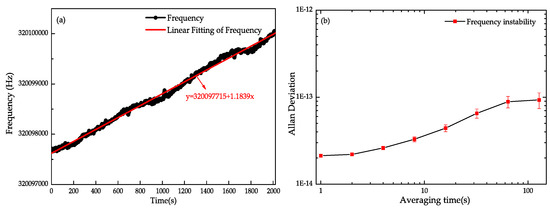 The beat signal was obtained between the ultra-stable laser output from the system and another 1550 nm ultra-stable laser system to evaluate the performance of the improved system. The beat signal is divided into two channels, one of which records the change of the beat signal over time through a frequency counter to measure the laser frequency stability, and another to measure the spectrum distribution of the beat signal through a spectrum analyzer to obtain the beat linewidth. The change of the beat signal over time, measured by the frequency counter, is shown in Figure 9a. The beat signal drifts from 320,097,715 Hz to 320,100,042 Hz within 2000s. By linearly fitting the beat signal, it can be seen that the linear drift rate is Hz/s. The frequency stability of the ultra-stable laser without the linear drift is shown in Figure 9b. The stability of the laser frequency is better than within 1 s.