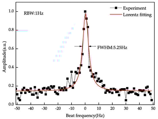 A spectrum analyzer is used to measure the spectral characteristics of the beat signal, and the resolution of the spectrum analyzer is set to 1 Hz to obtain the laser linewidth, as shown in Figure 10. The laser linewidth is Hz, as determined by the Lorentz linear function fitting. Since the temperature control and vibration isolation are turned off for the evaluation of the relocking algorithm, we believe that the frequency stability and linewidth should be improved with a better environment.