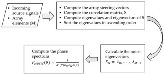 The flowchart of the MUSIC algorithm is summarized in Figure 2. The MUSIC algorithm’s performance is different when the received signals are different. The MUSIC algorithm fails to detect correlated input signals as the response of the MUSIC is not sharp at the peaks while it is sharp in the case of the uncorrelated input signal [].