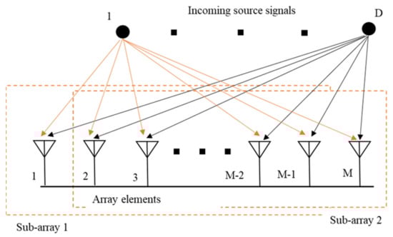 Schmidt (1986) proposed the MUSIC algorithm [], which is a subspace-based method. MUSIC stands for multiple signal classification. The MUSIC algorithm provides asymptotically unbiased estimates of the number of signals, directions of arrival (DOA), strengths and cross-correlations between the directional waveforms, polarizations, and strength of noise or interference. The model in Figure 1 states that the waveforms received at the M-array elements are linear combinations of the D incident wavefronts and noise.
