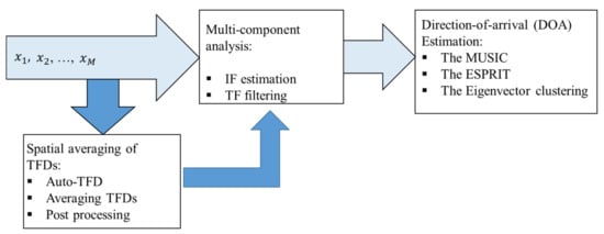 The resolution of the TFD plays an essential role in DOA estimation, mainly when the sources are closely located. Both the STFD and TF filter approaches heavily depend on the TFD’s resolution, which has higher computational cost and memory requirements. A DOA approach using the ADTFD, proposed by Khan et al., provided good improvements for non-stationary signals and the MUSIC algorithm []. The algorithm, illustrated in Figure 4, consists of several stages, including calculating and averaging TFDs, IF estimation, and TF filtering. Quadratic TFD is used to analyze the signals. The estimated IF components are used to design TF filtering [,].