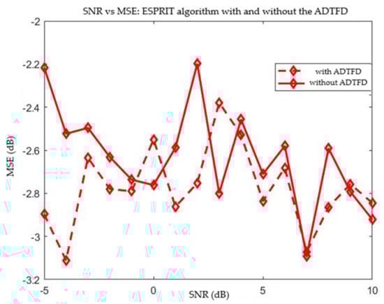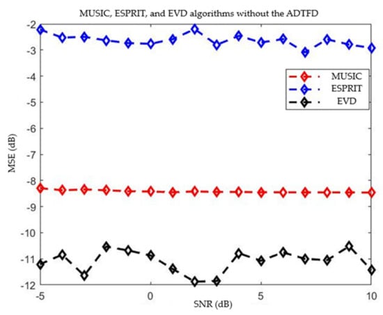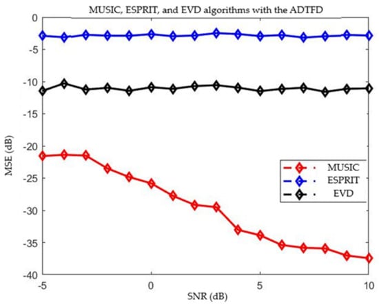 w(t) represents the Gaussian noise. Signals are received at each sensor with an SNR value of −5 dB, 0 dB, 5 dB, or 10 dB. The angles of the sources are 15, 30, 45, and 60 degrees. The performances of the reviewed DOA methods, MUSIC, ESPRIT, and Eigenvalue Decomposition (EVD), are given in Table 1 and Table 2 with and without the ADTFD algorithm, respectively. The EVD algorithm performed better than the MUSIC and ESPRIT algorithms in estimating the DOAs without the ADTFD under different SNR values. Corresponding mean square error (MSE) values in dB are depicted in Figure 5. The EVD algorithm’s MSE values were around −11 dB, while the ESPRIT algorithm’s MSE values were around −3 dB. The MUSIC algorithm produced a steady MSE of about −8.2 dB for different SNR values. The ADTFD algorithm in the preprocessing stage improved the MUSIC algorithm’s performance significantly. On the other hand, the ESPRIT and EVD algorithms did not benefit from the ADTFT. The DOAs are given in Table 2. The MSE versus SNR plot for the DOA algorithms with the ADTFD for different SNR values is shown in Figure 6. The MSE values of the MUSIC were calculated below −22 dB with the ADTFD.
