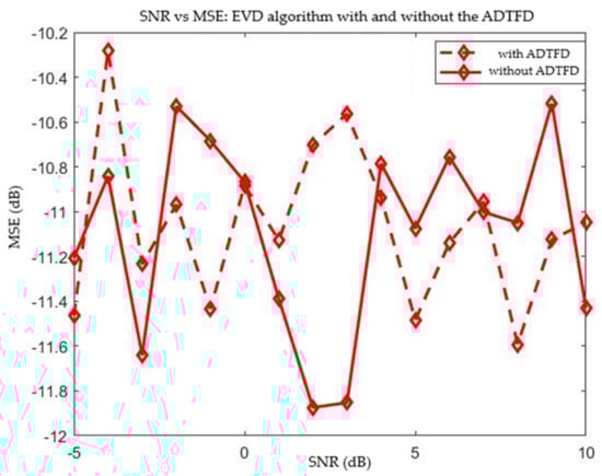 SNR vs. MSE plot of the EVD algorithm with and without ADTFD (solid line and the dashed line represent the cases without ADTFT and ADTFD, respectively).