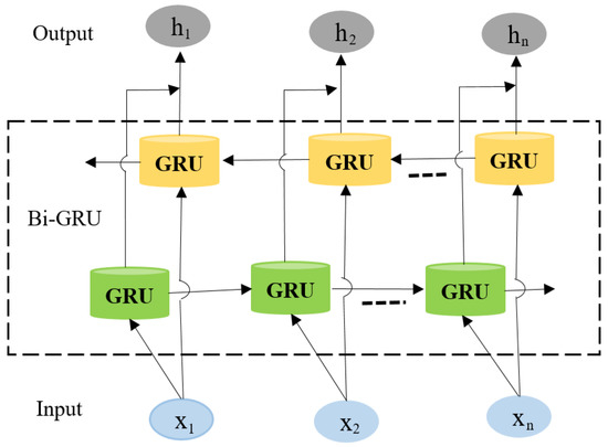 where and are the weight matrix form of the forward and backward directions of the GRU layer and and are the bias of the forward and backward directions of the GRU layer, respectively. Compared with the LSTM network, the number of parameters, the complexity of the GRU model, and the experimental costs are reduced [50].