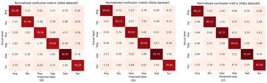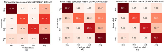 Figure 4a–c show that, on the IEMOCAP dataset, in the happiness class, the recognition rate all of the modules is low (around 40% to 50%). All of the algorithms found happiness difficult to detect at a reasonable performance rate.