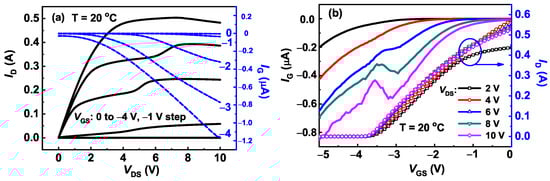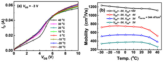 The extracted mobility exhibited a slight decrease below C for the case of = 2, 3, and 4 V, which is believed to be the result of the impurity scattering effect induced by the aforementioned acceptor-like traps. Acceptor-like states are capable of trapping free carriers, which will perform as impurity scattering centers as a result [28]. Since the impurity scattering will become gradually violent as the temperature decreases [29], it will show degradation on the carrier mobility at a low temperature, as shown in Figure 5b. Therefore, a higher corresponding to a higher is required to compensate the increased impurity scattering, as shown in Figure 4b. However, once the traps are discharged to be neutral at high drain bias, e.g., = 10 V, the impurity scattering will become weak, and the temperature dependence of the mobility changes to a phonon-scattering dominated behavior (Figure 5b). As the properties will be degraded at a high temperature by impact ionization [10,26], may rise further as a result of its mobility-dependent properties.