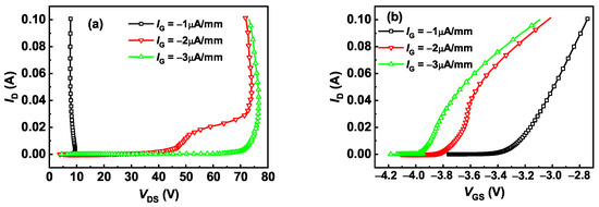 The ON-state breakdown loci () of the fabricated device were measured by the gate current extraction technique, as shown in Figure 2a. The gate current was held constant at different predefined values (−1/−2/−3 A/mm), and was ramped from − (OFF-state) to 100 mA (ON-state). The corresponding drain–source () and gate–source voltages () were monitored and shown in Figure 2a,b, respectively. At of −1 A/mm, the monitored increased rapidly with in the OFF-state as was below . The gate leakage current in this region was expected to be dominated by electrons injected from the gate into the channel through thermionic field emission and tunneling, and the increase of the was driven by the increase of the drain current to turn on the channel gradually [23]. Once increased above and turned the device ON, lower drain bias voltage was enough to sustain the drain current, until an upsurge of featuring infinite conductance was observed.