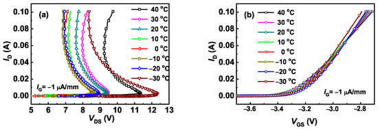 To verify the impact ionization characteristics in AlGaN/GaN HEMTs, the temperature-dependent ON-state breakdown loci of the fabricated devices were performed from 40 to −30 C, as shown in Figure 3. It shows a rapid degradation of the device’s properties both at a high and a low temperature, where the high temperature degradation has been reported as the cause of the impact-ionization-induced hot electrons [10], and the degradation at a low temperature is considered as a result of the carrier mobility decrease. For all the measured temperature, the loci exhibited similar features except for the different minimum value of (). It decreased from 9.3 to 6.8 V from 40 to −10 C and then reversed to increase to 8.4 V as the temperature further decreased to −30 C. Note that a further increase of over the infinite conductance region made the loci bend forward to a higher again. This was due to the reduction of the peak electric field in the gate–drain region (roughly proportional to ) and consequently of the impact ionization rate, as increased further with . To maintain a constant , a higher was required again [23]. Moreover, the forward bending of loci became more evident at a higher temperature, since the impact ionization features a negative temperature coefficient.