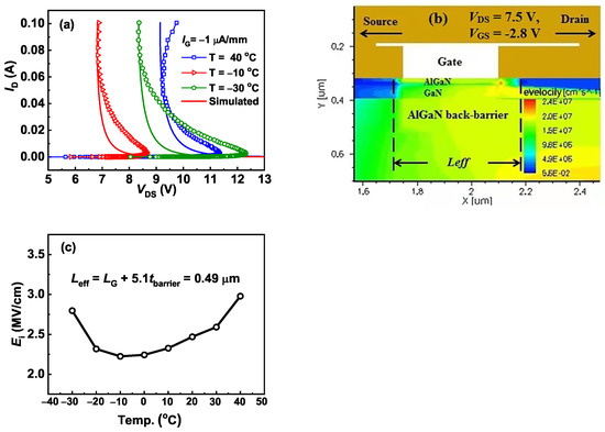 The effective gate length of the fabricated device was determined to be 0.49 m by the formula of from [25] and was consistent with the simulation results, as shown in Figure 4b. The electron velocity distribution was simulated under the ON-state breakdown measurement condition ( = 100 mA/mm, = 7.5 V, = −2.8 V). As the result of drain bias, the electrons gradually accelerated under the effect of the electric field and led to a higher velocity on the drain side. The characteristic electric field was extracted and plotted with temperature in Figure 4c. It featured a U-shaped temperature-dependent behavior, with minimum occurring at −10 C. The monotonic increase of with temperature above −10 C is a typical behavior of impact ionization [26], while its increasing with decreasing temperature below −10 C suggests that other scattering mechanisms featuring a negative temperature-dependent behavior come into play. The extracted s were at 20 C and 2.5 MV/cm.