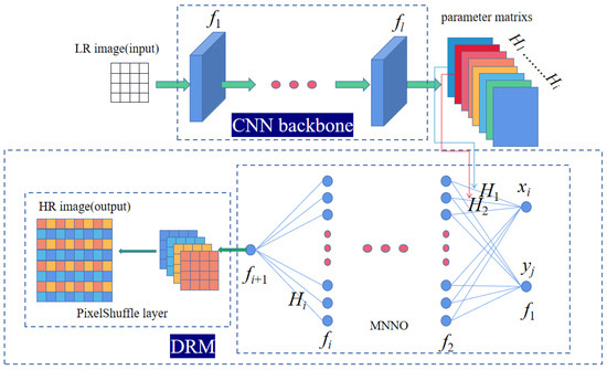 The proposed LDRN consists of the CNN backbone and the DRM. The CNN backbone is used to generate the parameter matrix, and the DRM is used to generate the HR image.