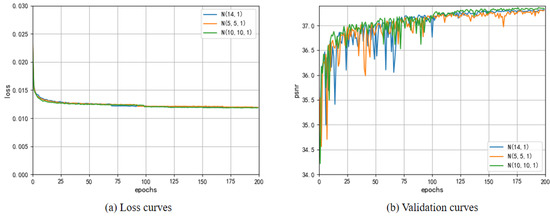 The distribution reconstruction module (DRM) is the core module in achieving the super resolution. As argued in Section 2.4, a deeper neural network in MNNO would suffer from gradient back-propagation and cannot achieve a better performance. We show the training loss curves and validation PSNR curves using , and settings in Figure 4. The setting obtains a closed number of parameters to . Comparing the curves of and , using a similar scale of parameters to construct a deeper neural network cannot achieve a better performance. Moreover, from the results of , using much more parameters to construct a deeper neural network also provides little help in improving the performance. Therefore, we adopt a two-layer neural network in MNNO to formulate the DRM.