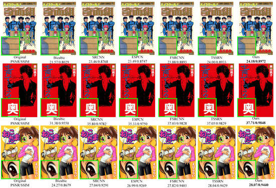 The “HighschoolKimengumi_vol20”, “AosugiruHaru” and “Nekodama” images from the Manga109 dataset with an upscaling factor of 4.