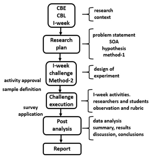 This investigation was classified as applied research [] with an experimental and descriptive scope []. The aim was to obtain preliminary results that could contribute to a hypothesis generated from the domain of CBL within CBE. The problem is defined in the context of a society that needs professionals who master pertinent competencies required to solve real complex challenges. Because some problems are not precisely defined until the engineer examines them, it is valuable to have competent professionals able to build upon their previous learning with a research approach to arrive at innovative solutions. In addition, during this project, the descriptive feedback of the participants was an important consideration of the experiment.