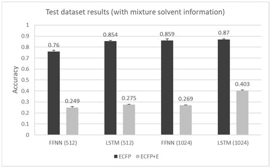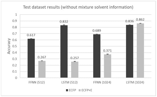 The experiments with two vectorization methods (ECFP, ECFP + E), two classifiers (FFNN, LSTM), two vector lengths (512 and 1024), and two versions of the dataset (with solvent mixture information and without) were performed. Each experiment was repeated three times; the results were averaged, and the confidence intervals (with a confidence level of 95%) were calculated. The obtained accuracies are visually presented in Figure 3 and Figure 4; for more detailed results (including the Precision, Recall, and F1-score values) see Table 4 and Table 5.