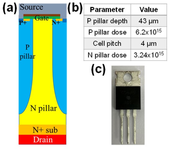 Figure 1a shows the structure diagram of the device cell. In the body area of each cell, the P-pillar and N-pillar are aligned alternately. The main feature size and doping concentration of the device are also demonstrated in Figure 1b. For testing convenience, the device is packaged using TO-220 as depicted in Figure 1c. The thickness of the gate oxide layer is 100 nm, with thickness inhomogeneity below 5%.