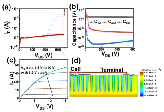 The full structure of the 650-V SJ device designed in this work is schematically shown in Figure 2d. The device structure is divided into cell and terminal regions (with only one cell illustrated in the figure). The terminal region is composed of alternating P- and N-pillars and field plates. The terminal region is designed to sustain the transverse electric potential from the edge-drift region of the devices, ensuring that the edge will not break down in advance. It is noted that this 650-V class SJ is fabricated by deep trench etching and epitaxial growth manufacture process. A trench with a certain aspect ratio is formed by etching, followed by P-type silicon epitaxial growth filling the trench and surface planarization. An n-type layer was formed at the top of N-pillars to further reduce the on-resistance.