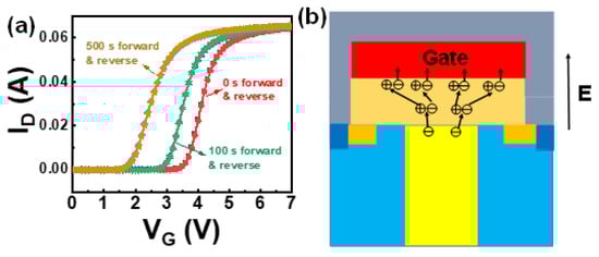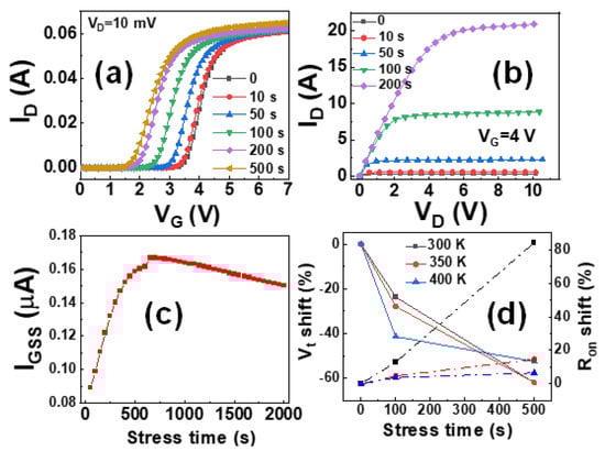 Figure 3a,b shows the ID-VG and ID-VD curves obtained after different stress time using the stress condition of VG = 75 V and VDS = 0 V. Here, the stress voltage of 75 V is much higher than the operation voltage under normal conditions, and this is based on the consideration of extreme cases with driving circuit chip failure. Under such circumstances, the high voltage from the drain terminal leaks to the gate, and the voltage between the gate and source rises to a much higher value.