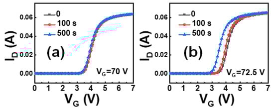 ID-VG curves measured after stress time of 0 s, 100 s, and 500 s with (a) VG = 70 V and (b) VG = 72.5 V.