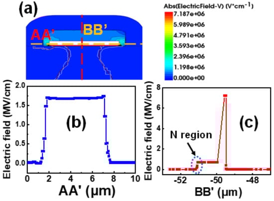 We first characterize the electric field distribution by using Sentaurus TCAD tools, which is shown in Figure 5a. The electric fields along the AA’ and BB’ (indicated in Figure 5a) are shown in Figure 5b,c, respectively. It is observed that under high positive gate voltage stress, the electric field in the N-type region under the gate oxide layer is sufficiently high, and hot electrons are generated which can easily be injected into the gate oxide layer.