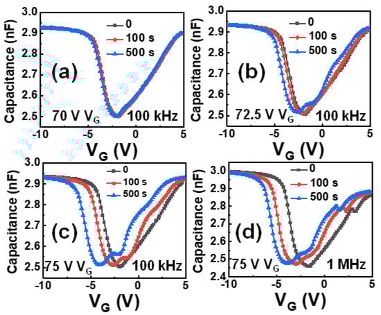 Variations of C-V curves measured at 100 kHz with (a) 70 V, (b) 72.5 V, and (c) 75 V stress voltage after stress time of 0 s, 100 s, and 500 s. (d) Variations of C-V curves (1 MHz) with 75-V gate voltage after stress time of 0 s, 100 s, and 500 s.