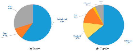 The third-largest interconnection network used in Top500 is a series of networks provided by Cray. A total of 7.4% of the systems on the Top500 list use it, including the fifth-ranked “Perlmutter” system. Cray’s interconnection products include Seastar [31], Gemini [32], Aries [33,34], and a new generation of high-performance network interconnection technology: Slingshot [35]. In the Top100, Cray interconnection includes not only the first Slingshot machine “Perlmutter”, but also a number of machines using the previous-generation “Aries” interconnection. There were five Slingshot machines and nine Aries machines in the Top100 as of November 2021. The three next-generation exascale supercomputers (EI Capitan, Frontier, and Aurora) announced by the United States will all use Slingshot interconnect technology.