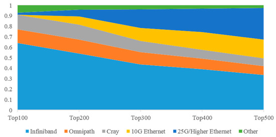 Figure 2 shows the interconnection distribution trend when the statistics of high-performance computer systems are expanded from the Top100 to the Top500. It can be seen that, with the increase in the number of statistical systems, the penetration rate of the Ethernet is rising. Many academic and industrial HPC systems cannot afford InfiniBand or are unwilling to give up Ethernet. As service providers, cloud builders, and HPC, they run Linpack on a small part of the cluster for a political or commercial reason. The relatively slow 10 Gbps Ethernet is very popular in the lower half of the Top500 list. In the list from 2021, the number of supercomputers interconnected with Ethernet has reached 240, nearly 50% of the total. The proportion of InfiniBand in the lower part of the Top500 list decreased, and its permeability decreased from 64% in the Top100 to 34% in the whole of the Top500. The reason for this phenomenon lies in the continuous improvements in Ethernet performance and the continuous reductions in the Ethernet price. The latest generation of Ethernet switches and network cards also includes important functions, such as remote direct memory access (RDMA) and intelligent network arrangement, which make Ethernet more attractive compared with traditional InfiniBand [16].