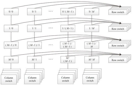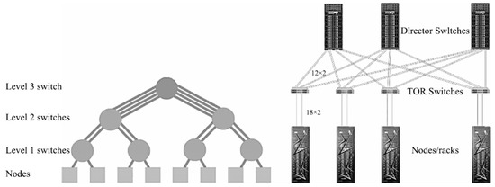 The Tianhe high-performance computer system uses the TH Express ICN developed by the National University of Defense Technology [12,13,14]. TH Express is composed of two ASIC chips. One is the network interface chip (NIC), which connects various nodes in the system to the network through a host interface and provides communication services for various systems and application software. The other is a network router chip (NRC), which connects the whole system through an interconnection topology and a switching network. The Tianhe exascale prototype system is composed of 512 nodes, and the single-node network bandwidth reaches 400 Gbps. The nodes are interconnected through the multidimensional fat-tree network topology shown in Figure 7, which can support 100,000 network nodes, and the maximum number of hops for communication between nodes does not exceed 5 [12].